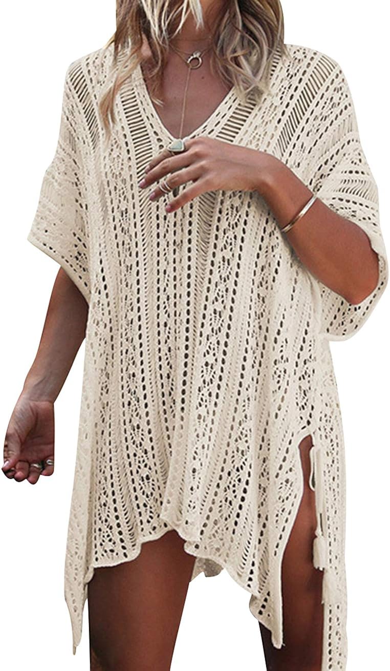 Crochet Beach Cover Ups Dresses Swimsuit Cover Up Dress Ladies Hellow Out Swim Coverups Womens V Neck Knit Bikini Swimwear Beachwear Kaftan Pool Bathing Suit Cover Ups Plus Size Covers Lovely Apricot